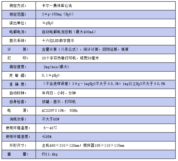 儀器符合GB/T7600;SH/T0246;GB/T606及采用卡爾—費休法測定樣品中水分的有關標準。 儀器采用了先進的自動控制電路,電解電流自動跟蹤控制,外型結構新穎,從而使該儀器工作更可靠,使用更方便,具有分析速度快(一分鐘出結果)、操作簡便、精度高、自動性強等特點,同時具有自動打印功能,可將實驗結果、做樣時間、樣品編號自動打印出來,廣泛應用于石油、化工、電力、鐵路、環(huán)保等部門。